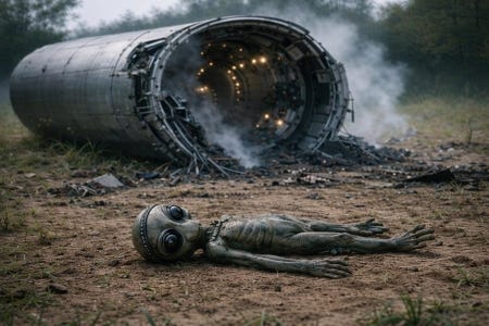 The Colonel walked over to the alien on the ground and gave it a nudge with his foot. “We’ve got a live one here. OK, call it in. Usual routine. Set up a one mile exclusion zone until we can get the craft and the eety airlifted to the facility. Tell the PR people to prepare some sort of cover story, whatever guff they think will work.”