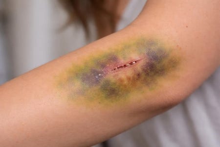 Yes, I did wash it thoroughly. Yes, I did use antiseptic. No, I didn’t call the doctor. It’s just a scratch. Although, it does sting a bit. And it’s definitely a strange colour - I think the bruise is spreading.